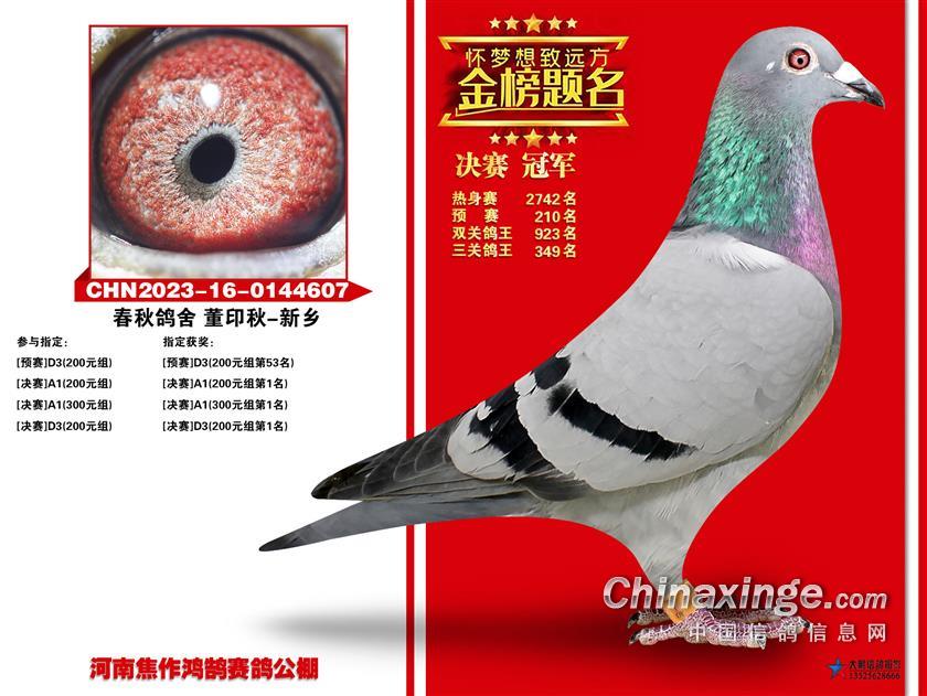 秉鸿鹄之志,圆冠军之梦!经过一个月的激励角逐,河南焦作鸿鹄赛鸽公棚2023年大奖赛顺利落下帷幕。春秋鸽舍-董印秋的2023-16-0144607灰鸽,在决赛一鸣惊人荣获冠军,分速为1381.2157米/分。骆红涛的2023-16-0427111雨点,关关为鸽主赢奖,热身赛52名、预赛冠军、决赛16名,拿下双关鸽王、三关鸽王“双料冠军”头衔。