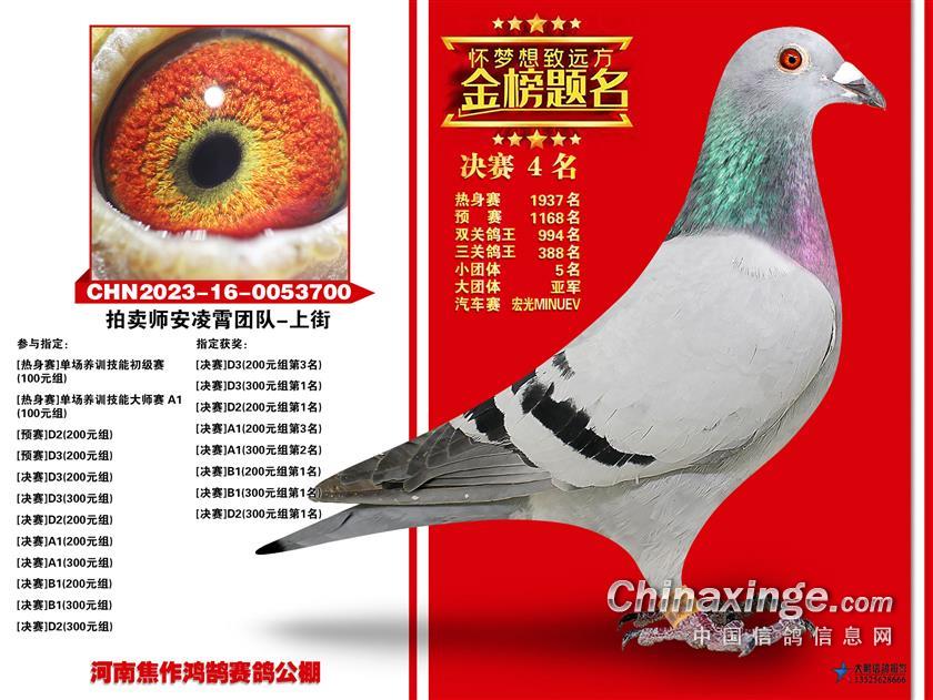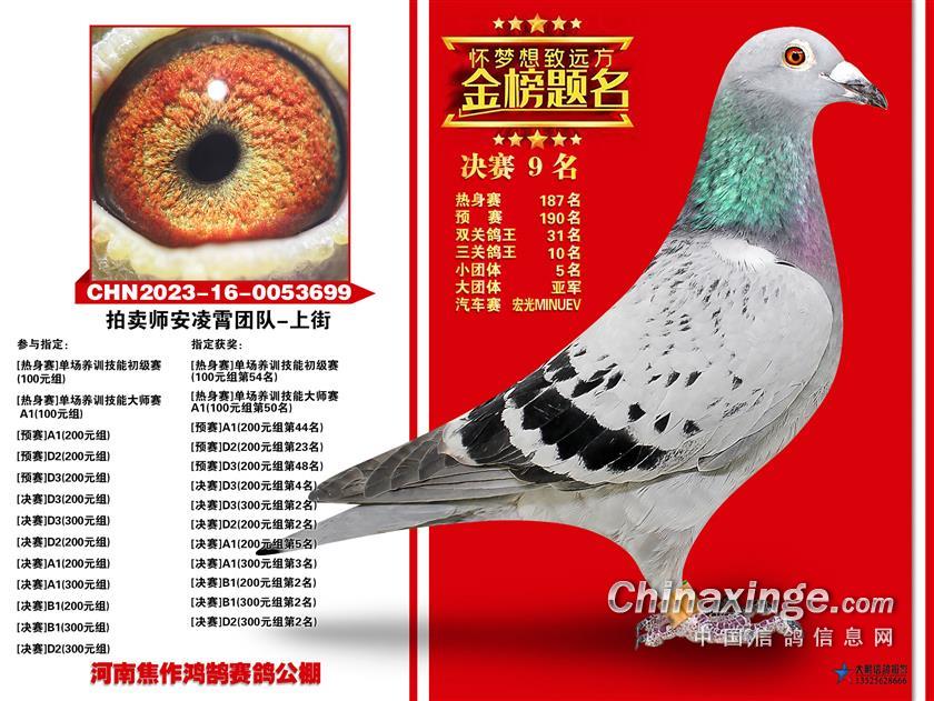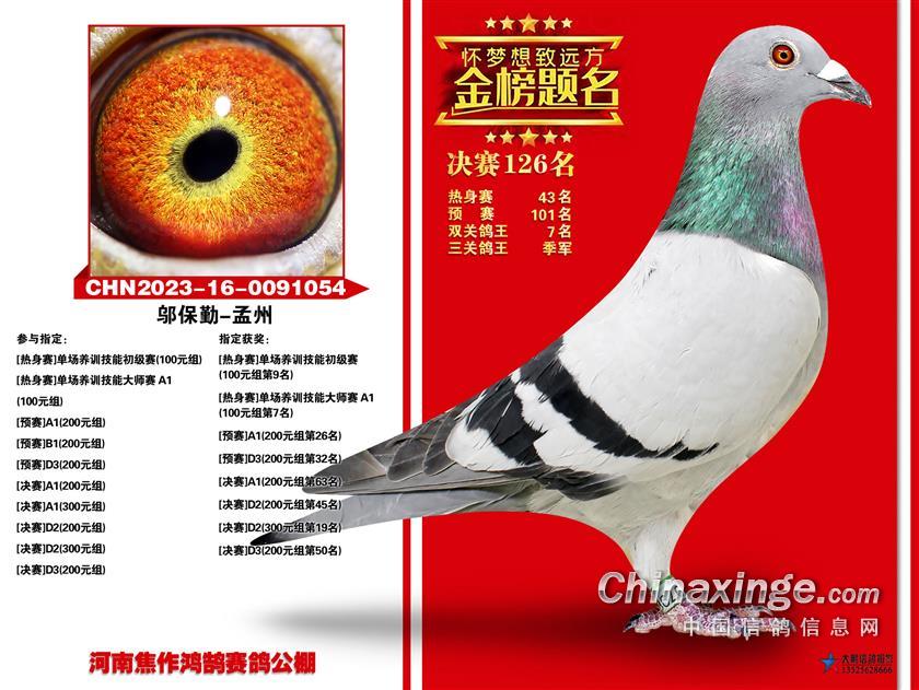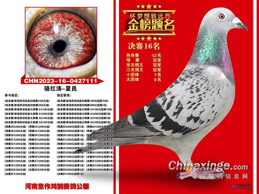 骆红涛的2023-16-0427111雨点,是今年三关比赛发挥最稳定也是最出色的赛鸽,关关为鸽主赢奖,热身赛52名、预赛冠军、决赛16名,拿下双关鸽王冠军、三关鸽王冠军以及多项娱乐赛大奖。韩学岭的2023-01-0827190雨点表现同样不俗,热身赛32名、预赛36名、决赛19名,赢得双关鸽王亚军、三关鸽王亚军。邬保勤的2023-16-0091054灰鸽获得三关鸽王季军。
