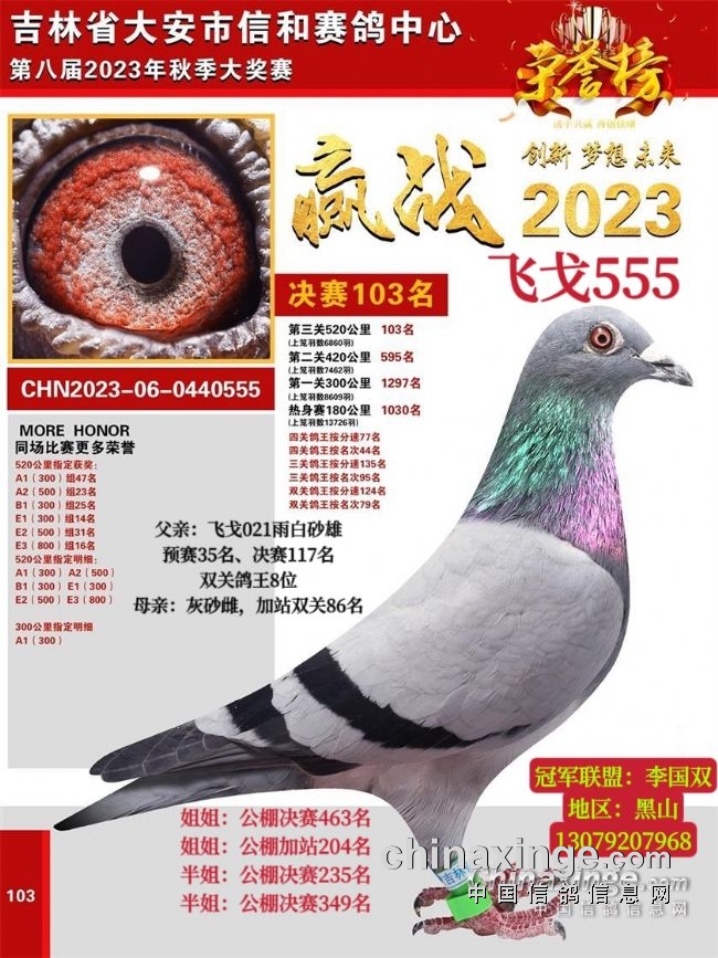 2023年春棚加秋棚比赛,一共入赏3羽奖鸽,全都是高位。