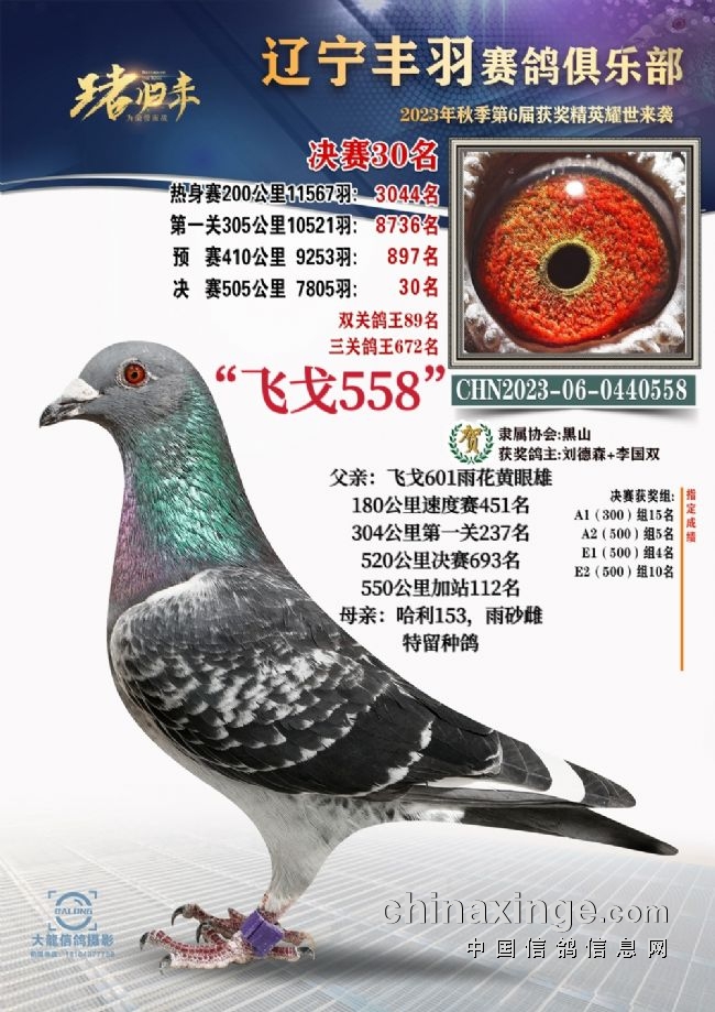 我的一羽参赛鸽567,第3关500公里决赛没有归巢,此鸽在第一关180公里飞1800多名,第二关300公里飞484名。