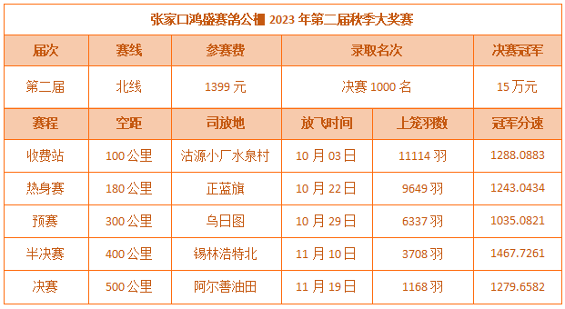 今年公棚举行第二届秋季大奖赛,参赛费工薪价位,仅为1399元,设有180公里热身赛、300、400、500公里四关赛,司放张家口黄金赛线正北线。决赛取奖1000名,其中11-500名各奖励10000元、感恩奖501-1000名各奖励9000元,诚意满满。
