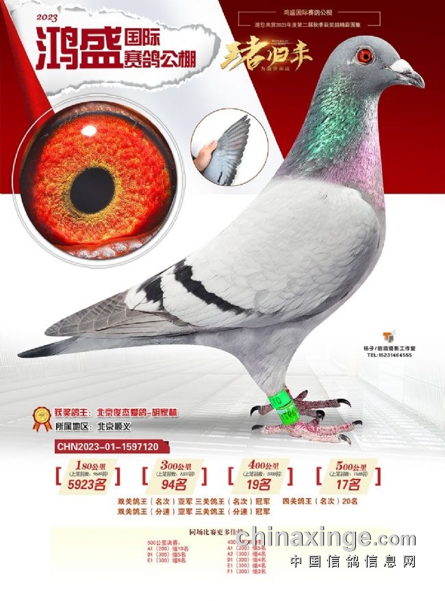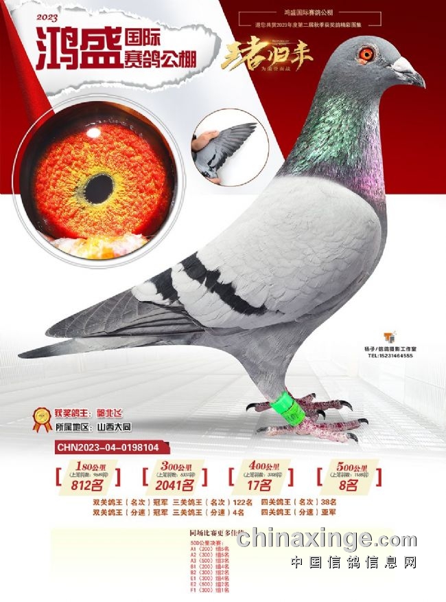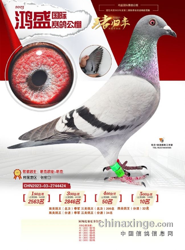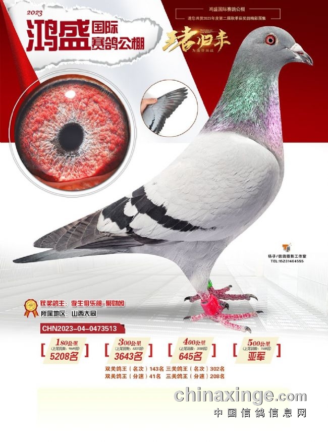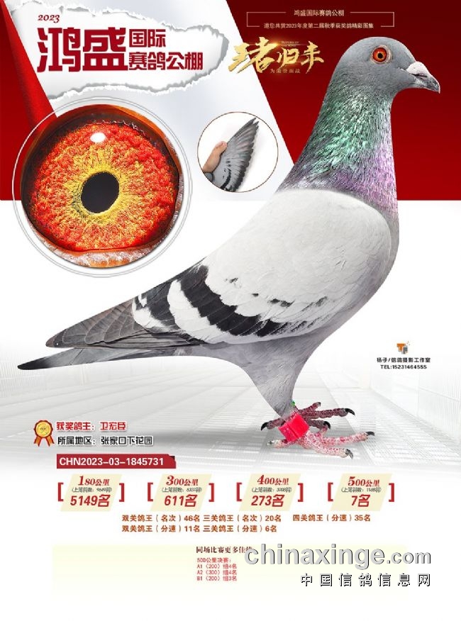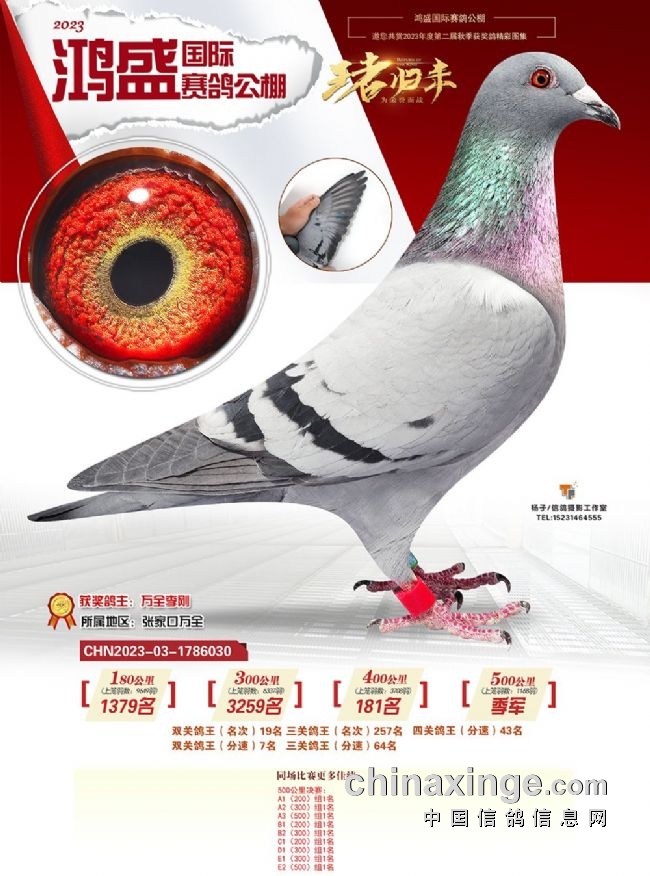 张家口鸿盛国际赛鸽公棚2023年秋季四关大奖赛,在一个半月的激烈争夺中落下帷幕,前三站万羽竞翔争头名,半决赛、决赛连续打了两场雪地赛,334羽“雪鸟”脱颖而出,赢得荣耀。旭阳鸽业-柴智的2023-04-1369488雨点鸽单枪匹马归来,领先27分钟,拿下决赛冠军。郭北飞的2023-04-0198104灰鸽以半决赛17名、决赛8名的好成绩,荣获双关鸽王冠军。北京俊杰爱鸽-胡家林的2023-01-1597120灰鸽更加出色,飞出了预赛94名、半决赛19名、决赛17名的优异成绩,荣获双关鸽王亚军、三关鸽王冠军。