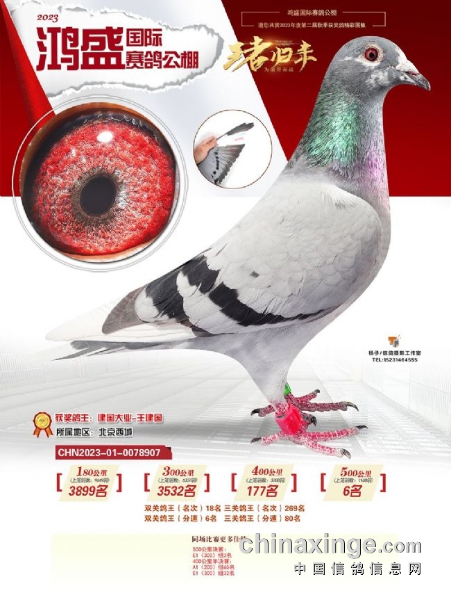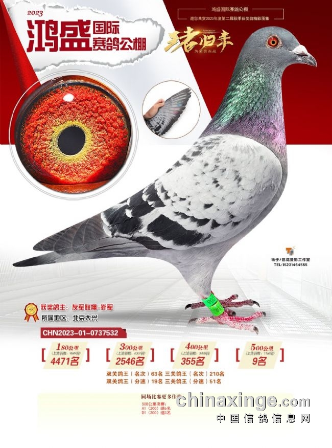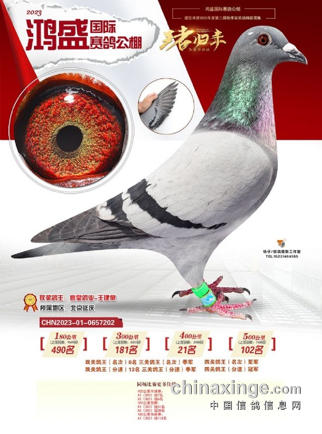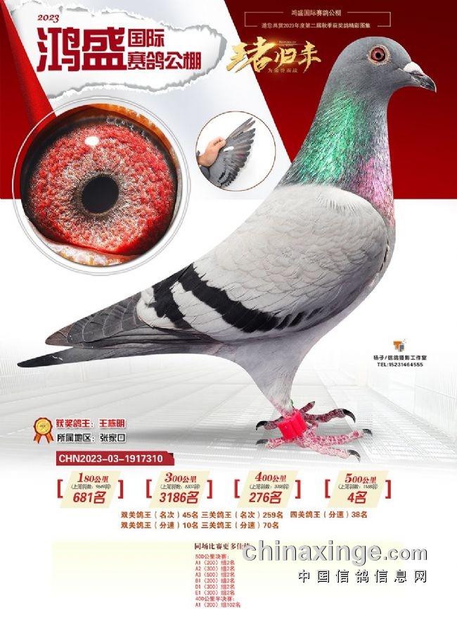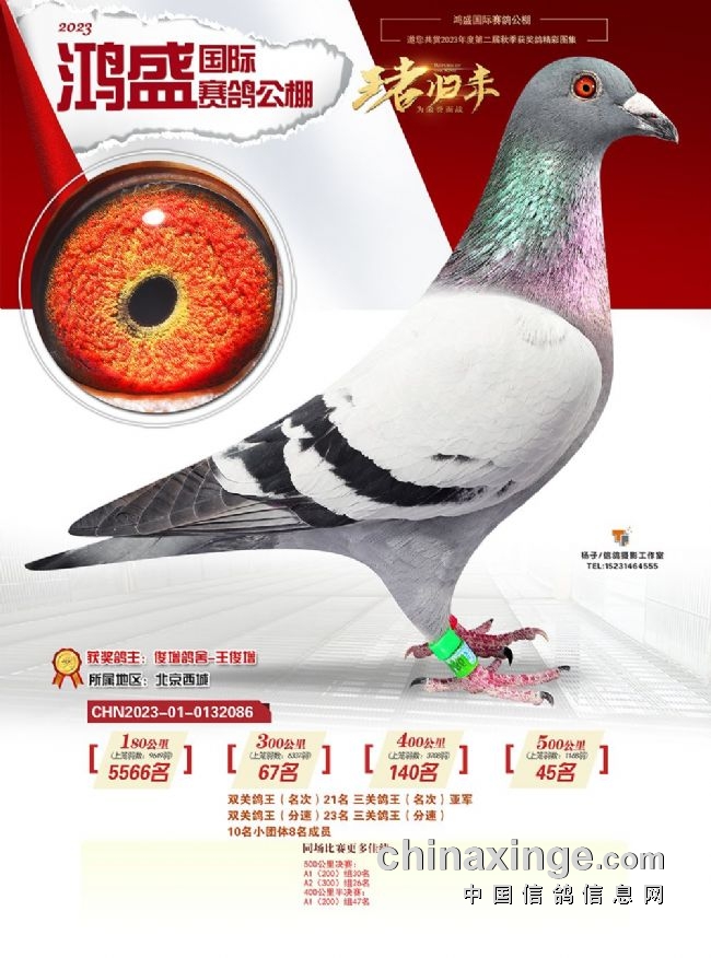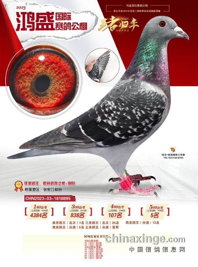 张家口鸿盛国际赛鸽公棚2023年秋季四关大奖赛,在一个半月的激烈争夺中落下帷幕,前三站万羽竞翔争头名,半决赛、决赛连续打了两场雪地赛,334羽“雪鸟”脱颖而出,赢得荣耀。旭阳鸽业-柴智的2023-04-1369488雨点鸽单枪匹马归来,领先27分钟,拿下决赛冠军。郭北飞的2023-04-0198104灰鸽以半决赛17名、决赛8名的好成绩,荣获双关鸽王冠军。北京俊杰爱鸽-胡家林的2023-01-1597120灰鸽更加出色,飞出了预赛94名、半决赛19名、决赛17名的优异成绩,荣获双关鸽王亚军、三关鸽王冠军。