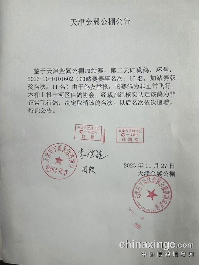 11月27日,公棚发布公告,加站赛排名第16名(获奖名次11名),环号为2023-10-0101602赛鸽,被鸽友举报非正常飞行。公棚上报监赛鸽会,裁判组核实认定该鸽为非正常飞行鸽,决定取消该鸽名次,以后名次依次递增。