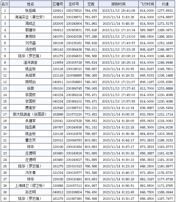 2023年上海市“兴业银行”杯城市业余联赛信鸽开封精英赛11月11日晚集鸽,13日早上7:15在河南省开封市郊外开笼。至上海市中心,实测空距763.68公里。时日多云天气,司放地气温仅2摄氏度,吹着南风,对从西向东方向飞行的赛鸽来说是侧风。气象报告显示,开封至上海一线,多云到晴,温度也由低到高。鸽友们都知道,天气、风向、温度、气流对赛鸽的速度影响巨大。特别是通过20多年的大量引入欧洲赛鸽,身体素质强健,飞速增长迅速。正当大家都在密切关注着、预测当天是否会有赛鸽归来时,天色渐渐暗下来。17:10:34,突然市鸽协比赛网站上跳出了一排数字,静安区会员郭建华的赛鸽归巢。17:13:03,崇明区会员袁俐华的赛鸽通过扫描,接着又有3羽赛鸽报到成功。18:41:08,上海浦东新区南汇会员张岳峰的2023-09-0275610出现在网站排列第一的位置上,以最高分速1277.6531米/分获得冠军,实际空距为789.479公里。