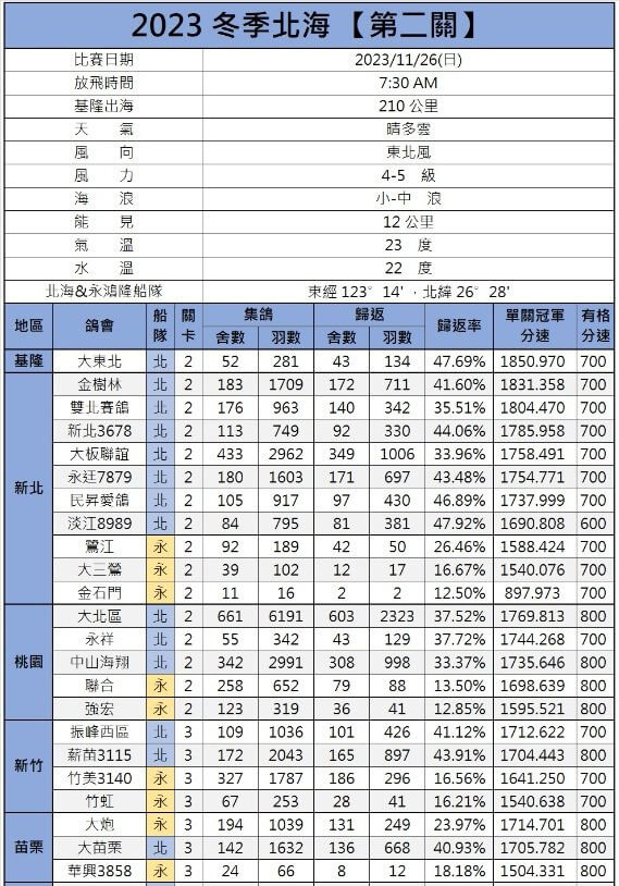 11月26日,2023年台湾北海冬季五关鸽王赛战至第二关比赛,这又是一场艰难的海翔赛,两艘船3.6万羽赛鸽同时放飞,虽然是4-5级东北风顺风,最高速度达1850米/分,但归巢情况却不佳,归巢率仅为33%。