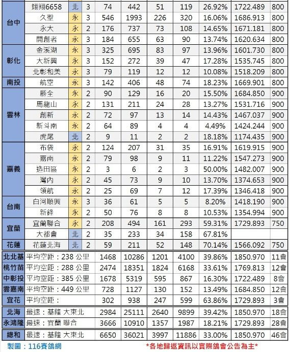 北海竞翔联合船队共计18家鸽会参赛,2984家鸽舍、25111羽赛鸽参加比赛,有效归巢2640家鸽舍、9899羽赛鸽,归巢率39.42%,最高分速1850.970米/分。