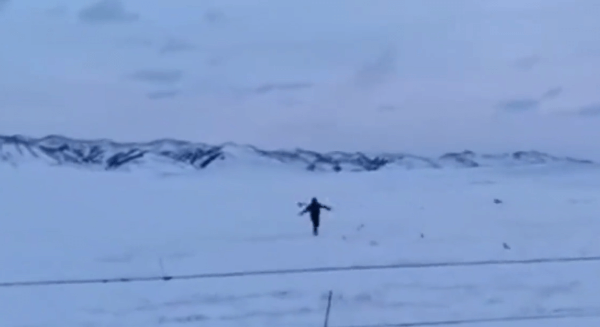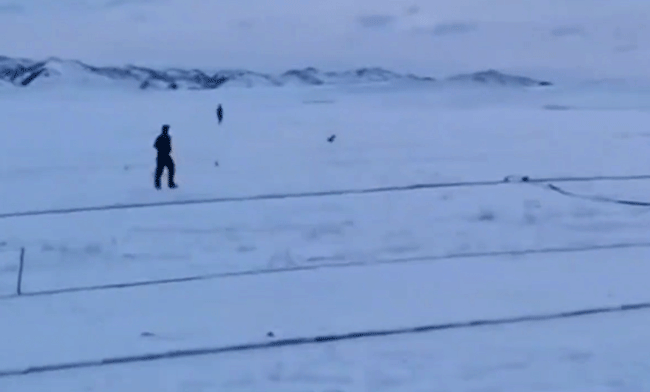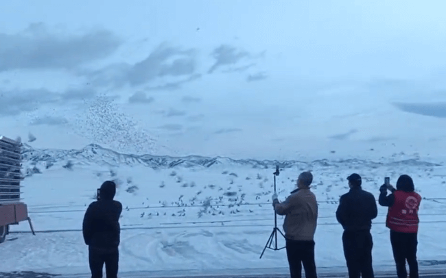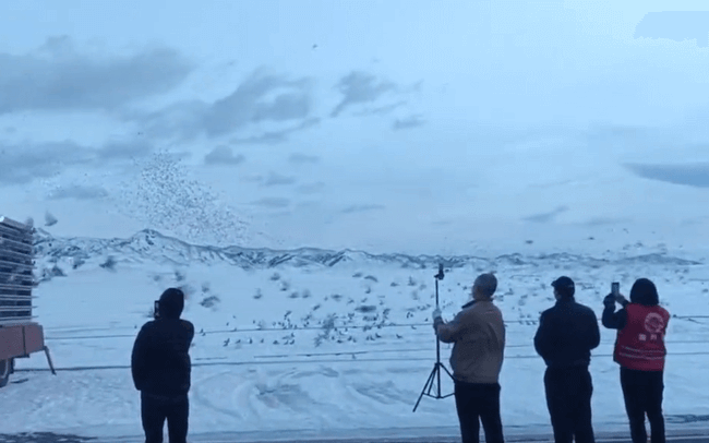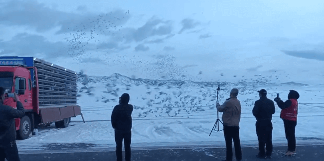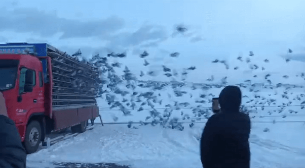 过后不久,有工作人员前往雪地里驱赶赛鸽,让它们起飞,继续完成比赛。