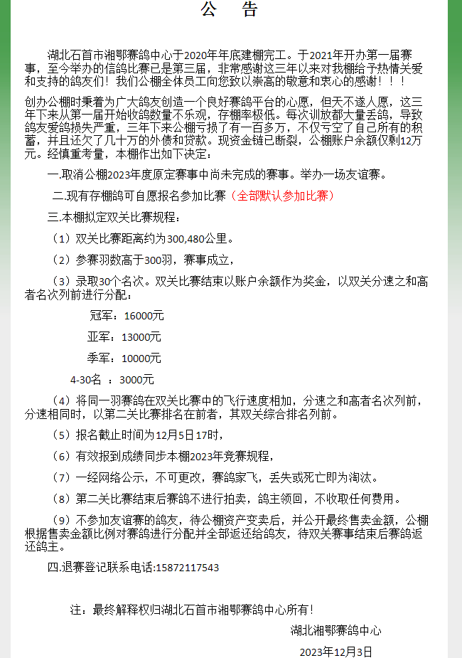 12月3日,湖北一家公棚发布公告,称公棚办赛三届,每一届都存在收鸽数量不乐观,存棚率极低,训放大量丢鸽的情况。导致鸽友损失惨重,公棚三年下来亏损一百多万。现资金链已断裂,公棚账户余额仅剩12万元,经慎重考量,公棚决定取消公棚2023年度原定赛事中尚未完成的赛事,举办一场友谊赛,现有存棚鸽可自愿报名参加比赛。并拟定双关比赛的规程:录取30个名次,距离约为300公里和480公里,参赛羽数高于300羽,赛事成立。