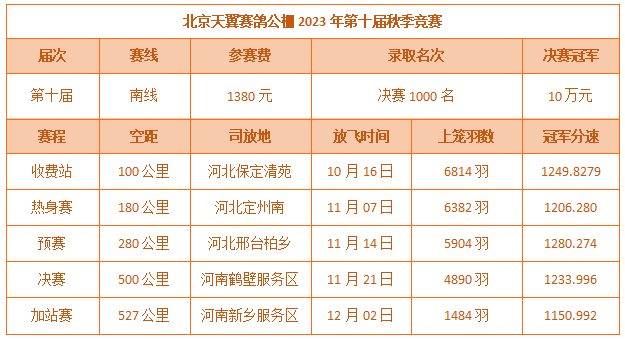 10月16日,公棚进行100公里收费站,上笼6814羽,归巢6500多羽,归巢率达96%,取得开门红。由于大雾天气,延期一个星期的第一关热身赛,于11月7日正式拉开序幕,放飞6382羽赛鸽,北京翼翔-王冲的2023-01-1599359灰鸽获得冠军,分速为1206.280米/分,两分钟报满100名,有效归巢5900多羽,归巢率达92%。11月14日,第二关预赛如期而至,5904羽赛鸽上笼,张楠+高国海+张健的2023-01-0768508雨点鸽荣获冠军,分速为1280.274米/分,比赛归巢4800多羽,归巢率达82%。