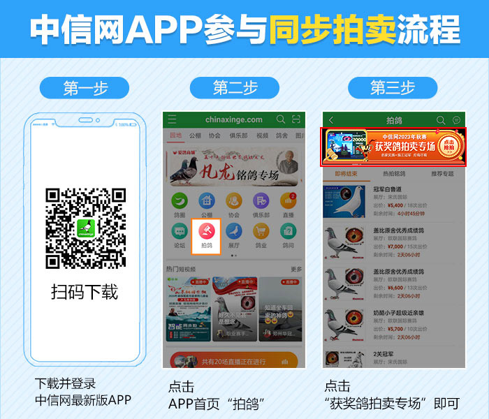 奖鸽登场,等您来拍!12月12日,北京天翼赛鸽公棚将举行2023年获奖鸽颁奖暨拍卖大会,届时还联合中信网开启“现场与网络同步拍卖+视频直播”服务,鸽友们可登录中信网,提前出价拍好鸽,边看直播边竞价,冠军奖鸽带回家!即刻下载中信网手机APP,轻松出价,快人一步!