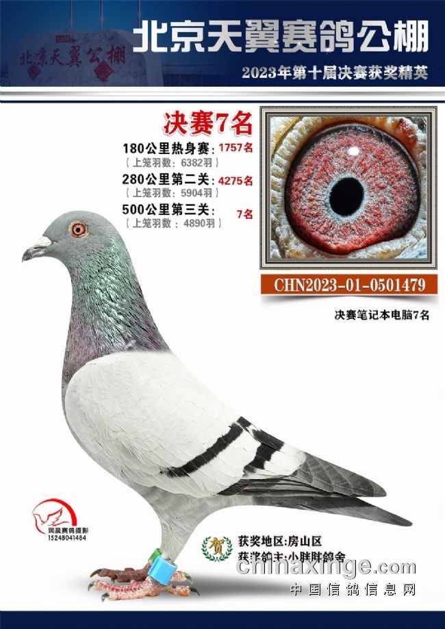12月2日,北京天翼赛鸽公棚擂响战鼓,为鸽友们再次搭台打一场加强赛,上笼1484羽赛鸽,当日归巢63羽,两天归巢479羽,明杭鸽舍的2023-01-0677596灰白条获得有奖赛冠军,比赛顺利结束。