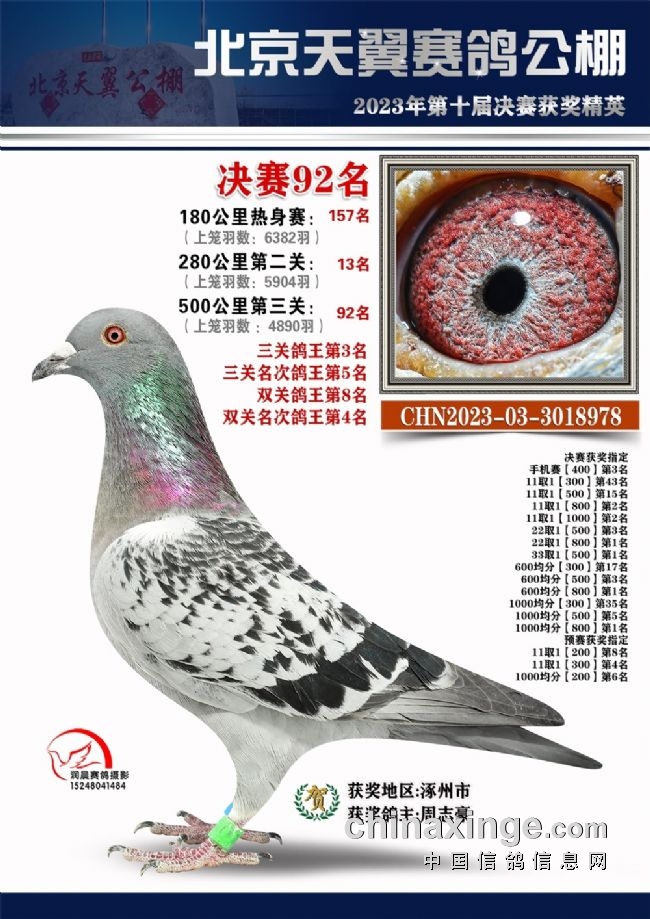 北京天翼赛鸽公棚2023年竞赛已经落下帷幕,收费站、热身赛归巢率超九成,预赛达八成,决赛近五成,交出了一份令鸽友满意的答卷。紫气东来-杨荣+黄建春的2023-01-1864629灰鸽单枪匹马归来,领先第二名6分钟荣获冠军,实力强悍。刘立刚的2023-03-2717414灰鸽飞出一关82名、二关7名、三关35名的全能数据,以3633.0594米/分的总分速获得三关鸽王冠军。
