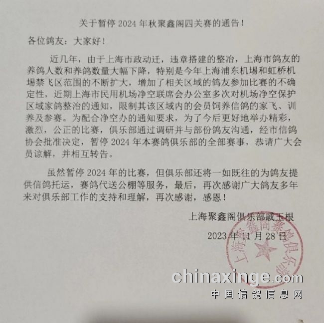 12月5日,上海聚鑫阁俱乐部发布通告,宣布暂停2024年四关赛。原因是上海市政动迁,整治违章搭建,使得上海市养鸽人数、养鸽数量均大幅下降。此外,上海浦东机场、虹桥机场禁飞区范围的不断扩大,上海市民用机场净空联席会办公室多次发布机场净空保护区域家鸽整治的通知,使得不少会员家飞、训赛受到限制。