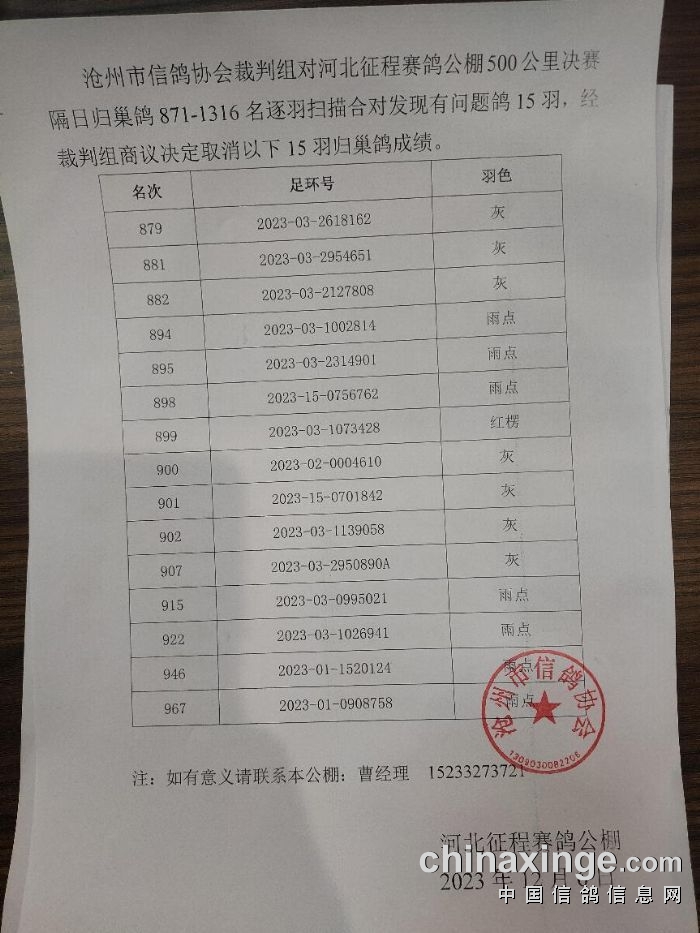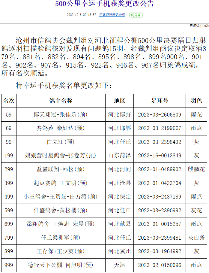 12月6日,河北征程赛鸽公棚发布公告,指出沧州市信鸽协会裁判组对河北征程公棚500公里决赛隔日归巢鸽871-1316名进行逐羽扫描验鸽,核对后发现有问题鸽15羽,最终取消这15羽归巢鸽成绩,所有名次顺延,并同步更改手机幸运奖名单。这15羽赛鸽的排名分别是879名、881名、882名、894名、895名、898名、899名、900名、901名、902名、907名、915名、922名、946名、967名。