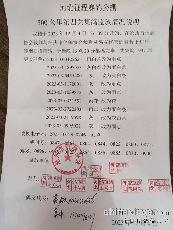 河北征程赛鸽公棚500公里(第四关)决赛,于12月5日在河南许昌开笼,上笼1937羽,决赛取奖1800名。比赛当日共计归巢870羽,两日归巢1316羽,冠军分速1364.5462米/分。