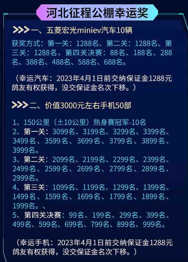 河北征程赛鸽公棚今年是首届秋赛,面向工薪鸽友,参赛费1280元,不过奖励丰厚,总奖金高达1050万元,决赛获奖名额多达1800名,其中冠亚季军分别奖励18万元、10万元、8万元,4-10名奖励2万元,11-50名各奖励1.2万元,51-700名奖励8000元,701-1000名奖励5000元,1001-1800名奖励1288元。(701-1800名交保证金可得)此外,还特别设置幸运奖,奖励五菱宏光miniev汽车10辆、价值3000元手机50部。