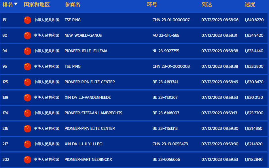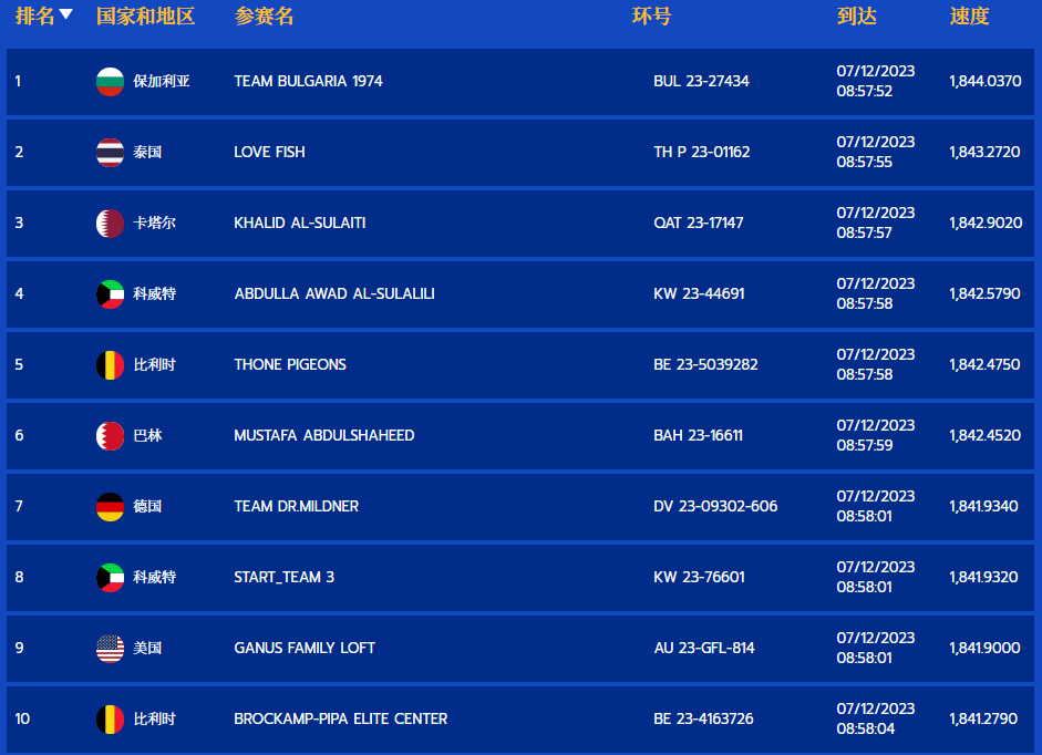 上午8点57分,第一羽归巢鸽报到,是保加利亚鸽友(TEAM BULGARIA 1974)的BUL23-27434赛鸽,分速为1844.0371米/分,拿下冠军。泰国鸽友LOVE FISH的THP23-01162、卡塔尔鸽友KHALID AL-SULAITI的QAT 23-17147,分别获得亚军、季军。比利时乔斯托内、美国甘纳斯获得5、9名。中国鸽友有4羽赛鸽入围前100名,最高排名19名,是TSE PING的CHN2023-01-0000007赛鸽。