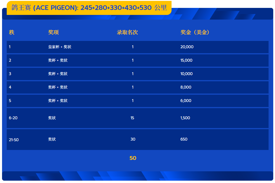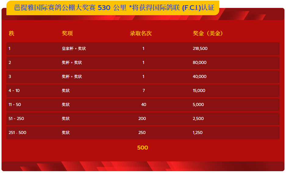 今年芭提雅国际大赛,总奖金200万美金,设有120公里热身赛、一关245公里、二关280公里、三关330公里、四关430公里、总决赛530公里、加站赛600公里七场赛事,前两关奖励前三名,三四关和加站赛奖励前100名,总决赛奖励500名,冠军奖励218500美金,亚军80000美金、季军40000美金。五关鸽王录取50名,冠军奖励20000美金。