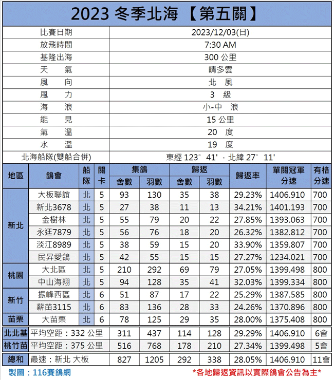 2023年中国台湾北海冬季五关海翔赛第五关比赛,于12月6日早上7点30分在基隆港出海300公里海域放飞,天气晴间多云,东北风3级,中小浪,能见度15公里。