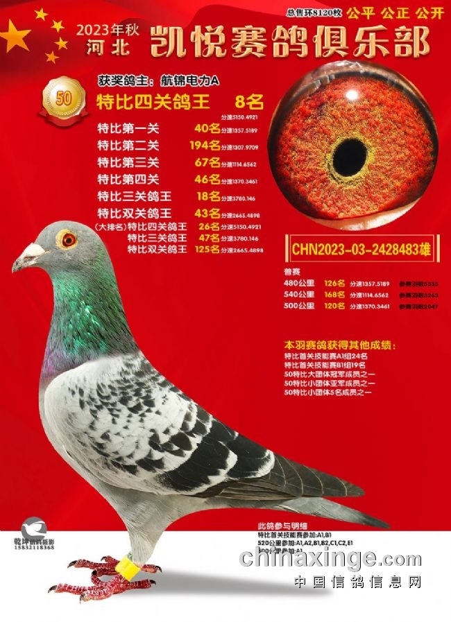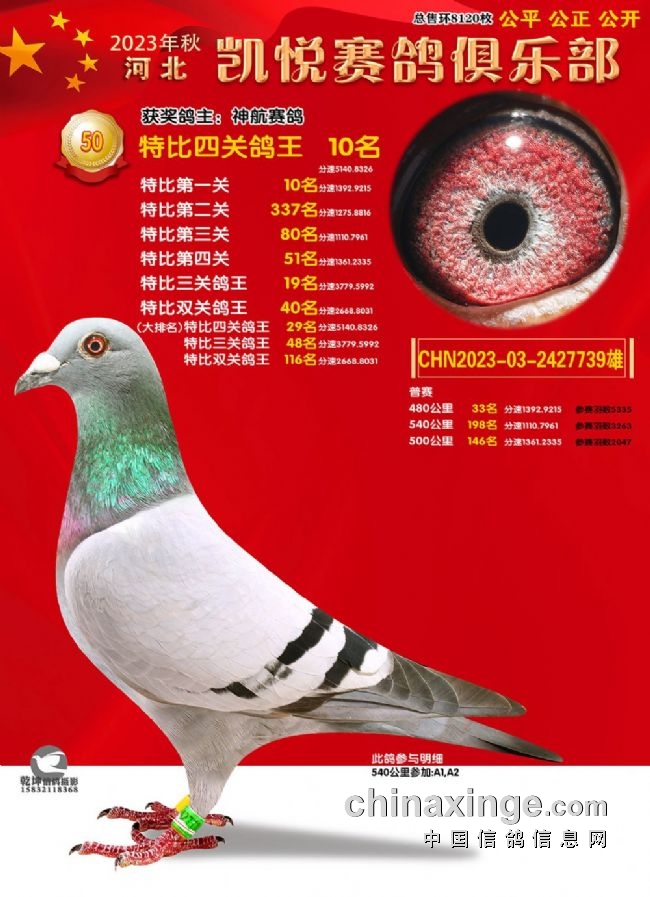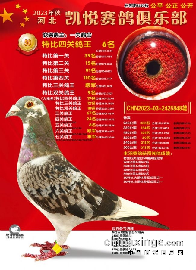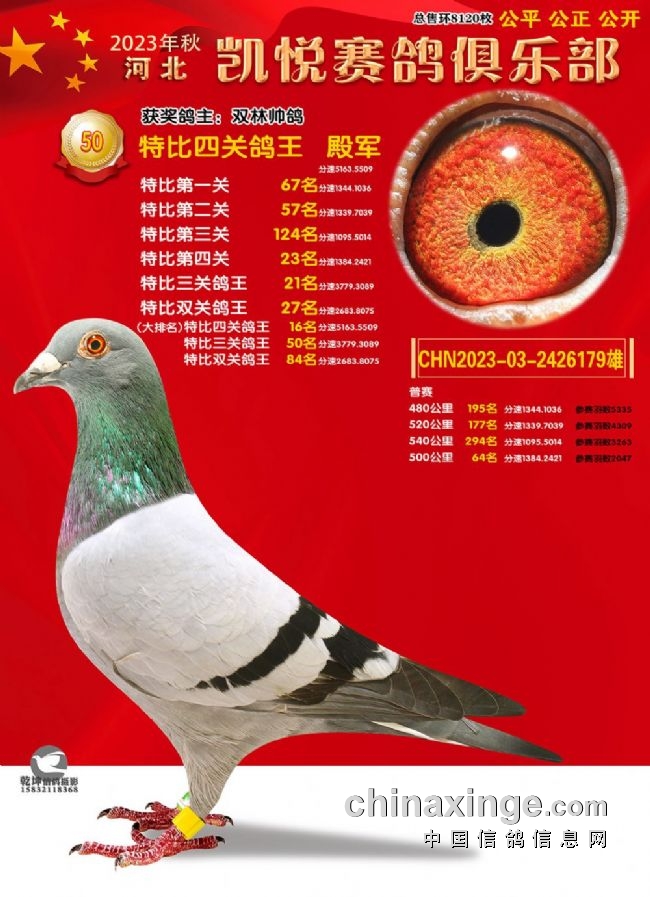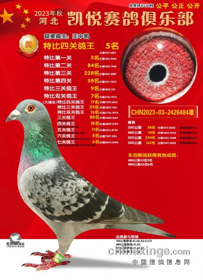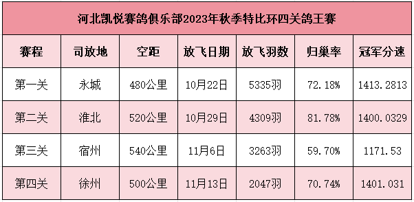 激战四关,龙争虎斗,河北凯悦赛鸽俱乐部今年秋赛飞出多个“双冠王”甚至“三冠王”。河北凯悦2023年第八届四关特比鸽王赛保底奖金36余万元,保底名次310名。本届为东南赛线,设480公里、520公里、540公里和500公里,以四关综合排名取奖。有鸽王赛、团体赛、精英赛、强豪赛、汽车赛等。