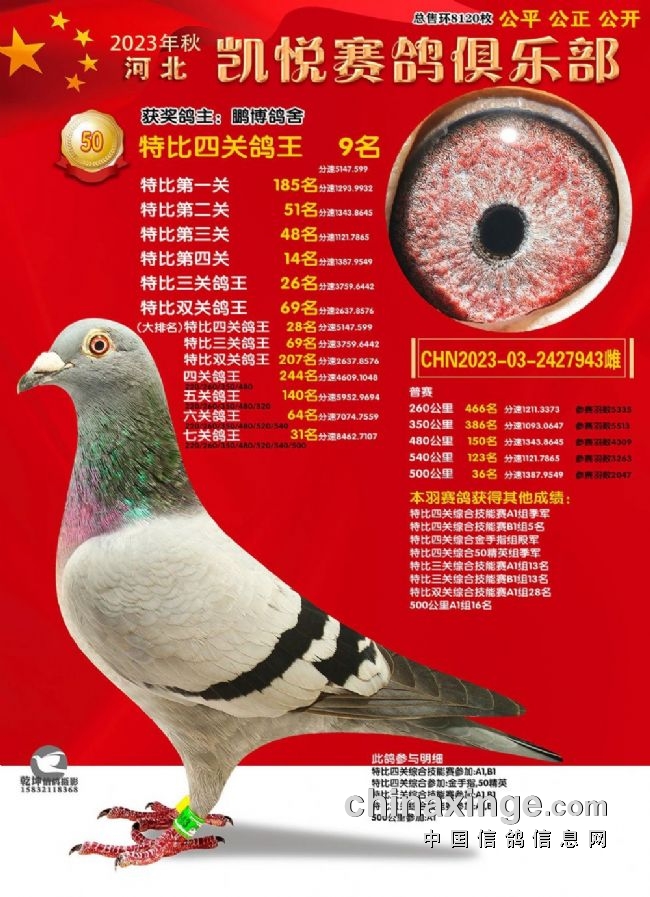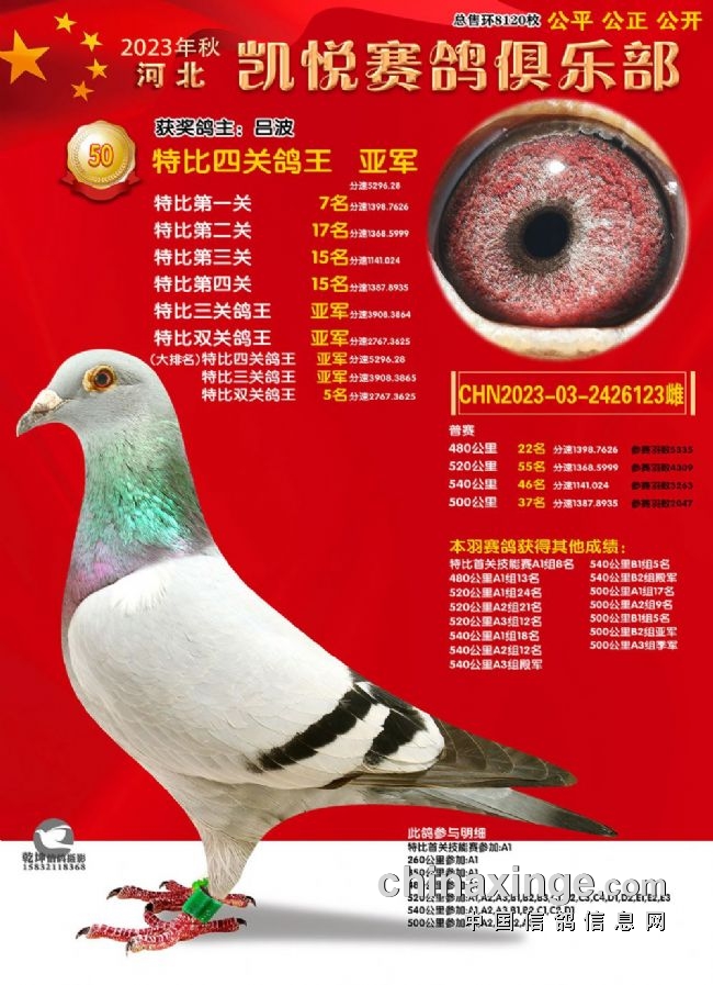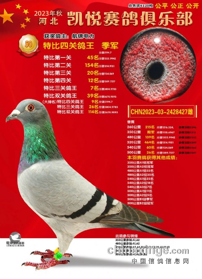 50特比鸽王冠军关关高位,冠绝群雄。金晟鸽舍+云中箭杨浩一羽环号为2023-03-1498177赛鸽惊艳亮相,以实在的功夫斩获50特比四关鸽王冠军,还是特比双关鸽王冠军、特比三关鸽王冠军的获得者,名次分明是:一关6名、二关冠军、三关53名、四关26名,总分速5301.9374米/分,赢得实战“三冠王”。吕波2023-03-2426123以四关总分速5296.28米/分的成绩拿下50特比四关鸽王亚军,排名依次是7名、17名、15名、15名,同时获得特比双关鸽王亚军和特比三关鸽王亚军,稳定的发挥是制胜的关键。50特比四关鸽王季军是航锦电力的2023-03-2428427,总分速5194.7米/分。