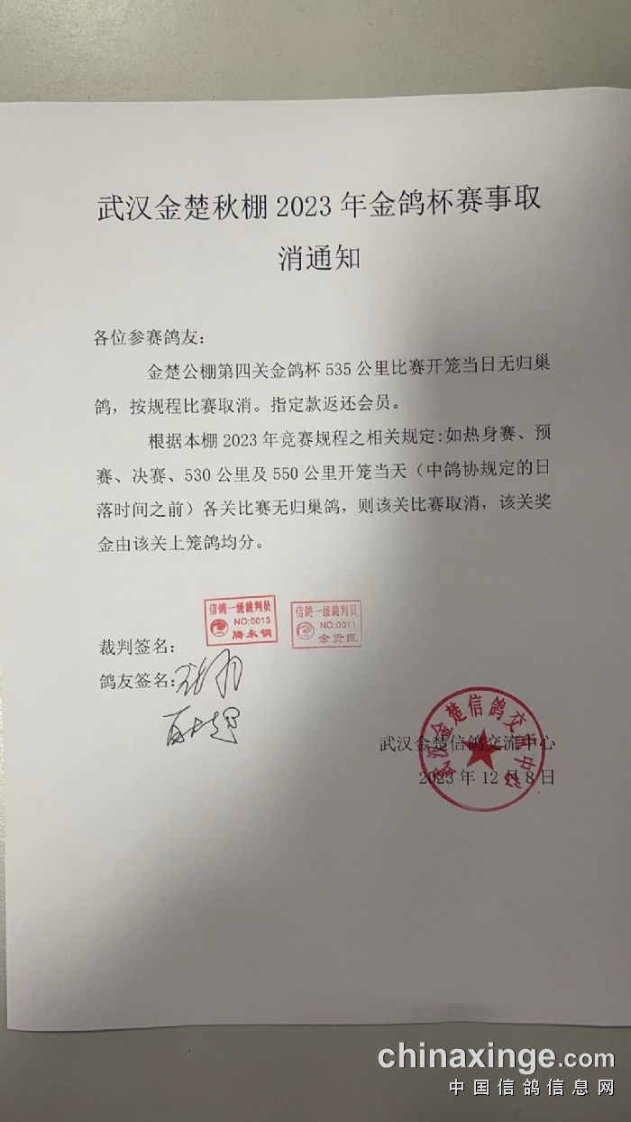 1、12月7日,湖北金楚赛鸽秋棚第四关535公里比赛,于早上7点30分在河南淇县开笼放飞,共计上笼1301羽赛鸽。比赛当日无鸽归巢,次日也没有见鸽。按照比赛规程规定,公棚发布取消比赛通知,比赛奖金由该关上笼鸽均分。