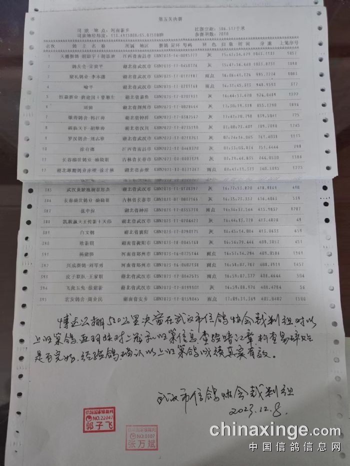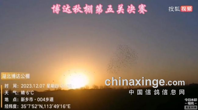 2、12月7日,湖北博达秋棚第五关520公里决赛,于早上7点38分在河南新乡开笼放飞,共计上笼2010羽赛鸽,录取800名。
