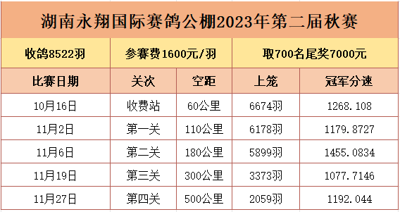 湖南永翔国际赛鸽公棚第二届秋赛圆满收官,本届比赛收鸽8522羽居湖南省榜首,60公里收费站、第一关110公里,小试牛刀,归巢率均超九成。第二关、第三关均归巢过半,实力亮剑。战至第四关500公里决赛,2059羽赛鸽出征湖北随州,接连需飞过汉江、长江、湘江,翻越大巴山脉、衡山山脉,大江大山阻隔,翻山又跨江,难度不小。最终古月传奇-胡周杰+老顽童的一羽2023180056967灰鸽夺下决赛冠军宝座,分速1192.044米/分,两日累计归巢860羽,顺利报满。来自江西的鸽友蓝天赛鸽-李卫兴的一羽2023-14-0128437灰鸽,凭借四关111名、176名、112名、35名拿下四关鸽王冠军。