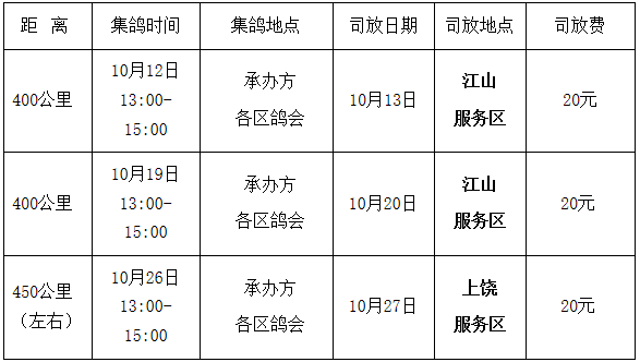 400公里 10月19日13:00-15:00 承办方各区鸽会 10月20日 江山服务区 20元