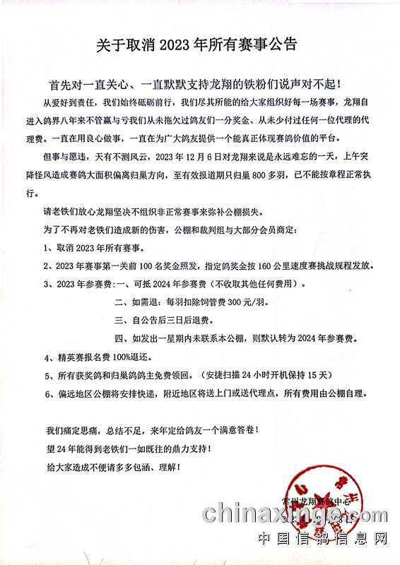 12月8日,江苏常州龙翔赛鸽中心发布一则“关于取消2023年所有赛事”的公告,公告表示,在12月6日的比赛中,上午突降怪风造成赛鸽大面积偏离归巢方向,至有效报到期只归巢800多羽赛鸽,已不能按章程正常执行。