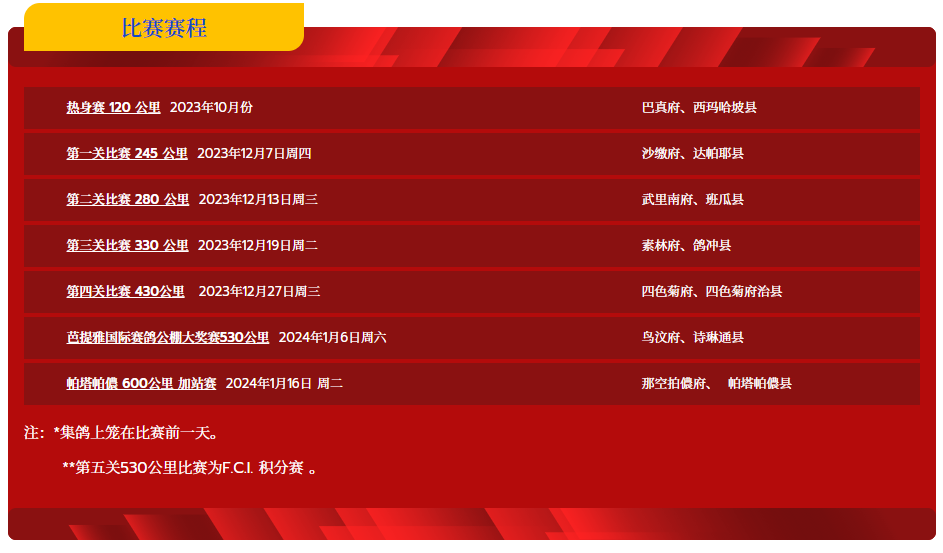 今年芭提雅国际大赛,总奖金200万美金,设有120公里热身赛、一关245公里、二关280公里、三关330公里、四关430公里、总决赛530公里、加站赛600公里七场赛事,前两关奖励前三名,三四关和加站赛奖励前100名,总决赛奖励500名,冠军奖励218500美金,亚军80000美金、季军40000美金。五关鸽王录取50名,冠军奖励20000美金。