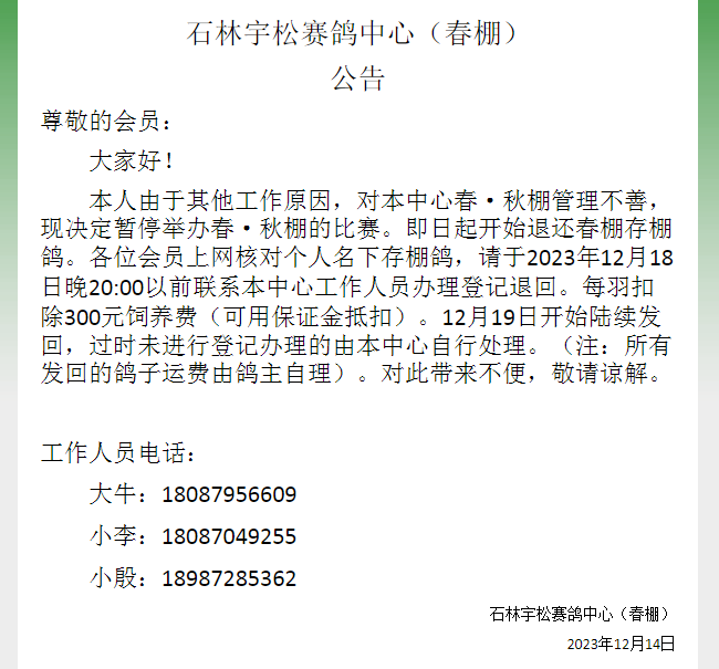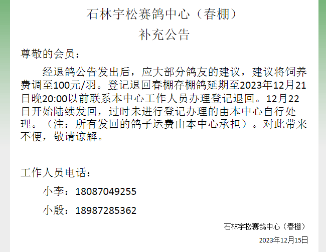 1.即日起开始退还春棚存棚鸽。各位会员核对个人名下存棚鸽,于2023年12月18日晚20:00前联系本中心工作人员办理登记退回。12月19日开始陆续发回,过时未进行登记办理的由本中心自行处理。(注:所有发回的鸽子运费由鸽主自理)
