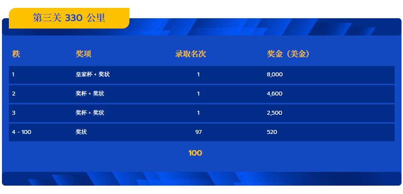 本关比赛录取100名:冠军奖励皇家奖杯、奖状和8000美金,亚军奖杯、奖状和4600美金,季军奖励奖杯、奖状和2500美金,4-100名奖励奖状、520美金。