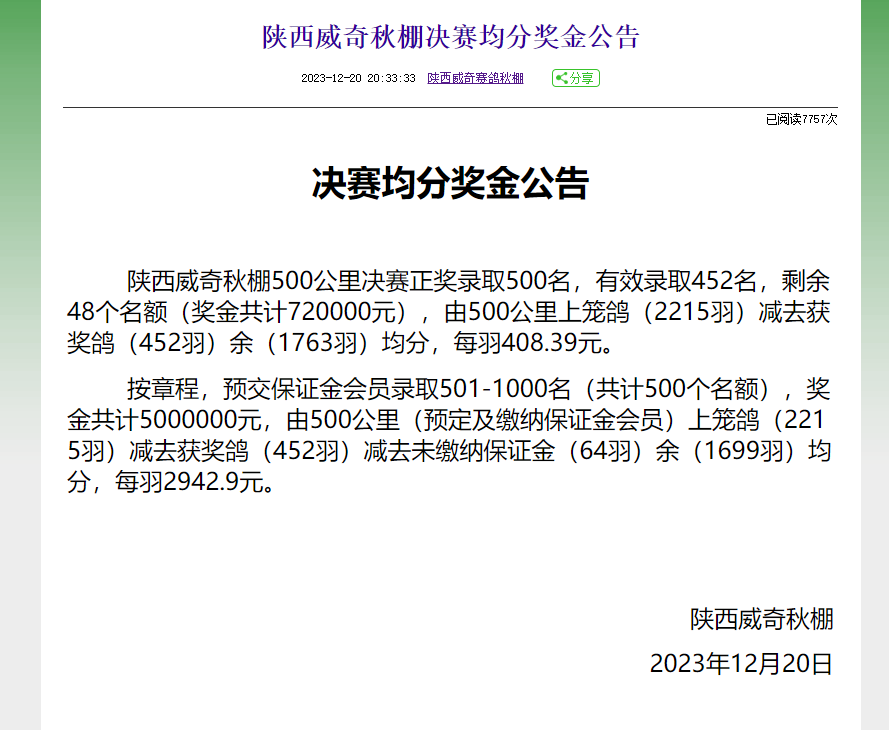 截至比赛当日17:53,归巢75羽,当日归巢为3.38%。次日继续报到,到20日傍晚比赛结束,共有效归巢452羽赛鸽,两日归巢率达到20.40%,未能报满录取名次。按照比赛规程,正奖剩余48个名额,有决赛上笼未获奖赛鸽均分,每羽408.39元。预交保证金501-1000名的奖金,由决赛上笼未获奖有资格的赛鸽均分,每羽2942.9元。
