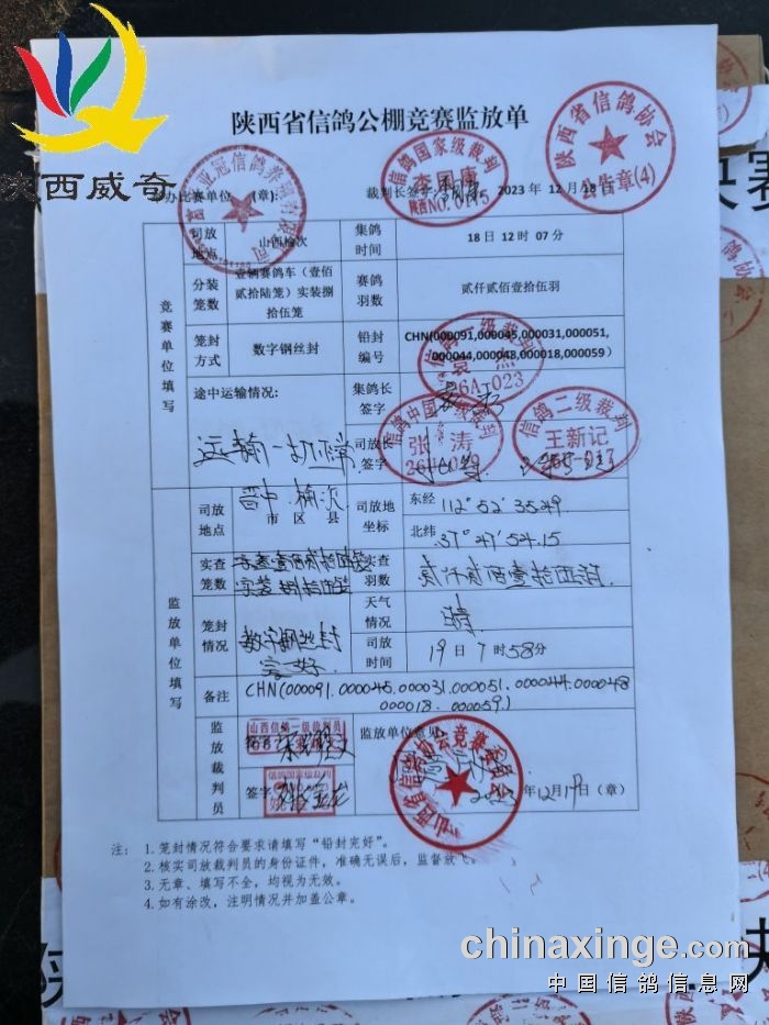 12月19日,陕西威奇赛鸽公棚第四关决赛,于早上7点58分在山西榆次开笼放飞,共计2215羽赛鸽,比赛空距480公里。比赛当天,司放地天气虽然晴朗,但气温较低,赛鸽在雪地里放飞。