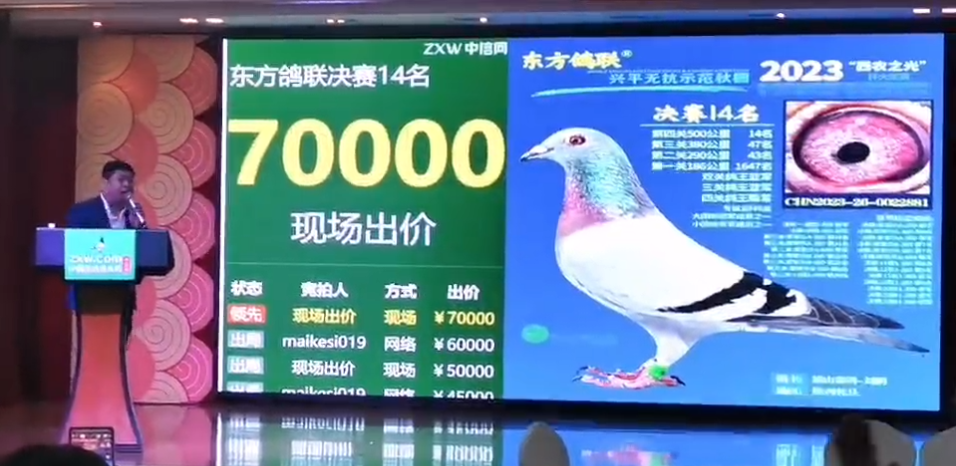 这羽14名战鸽竞拍气氛那叫一个激烈,起拍价为3000元,现场竞拍还没开始,网络鸽友已经开始了“争夺大战”,将价格出到了10000元。当然,现场鸽友自然不会“拱手相让”,前后经过20次网络和现场的出价,最终这羽鸽子以70000元的价格成交。果然,面对自己喜欢的鸽子,大家都会拼尽全力果断拿下。