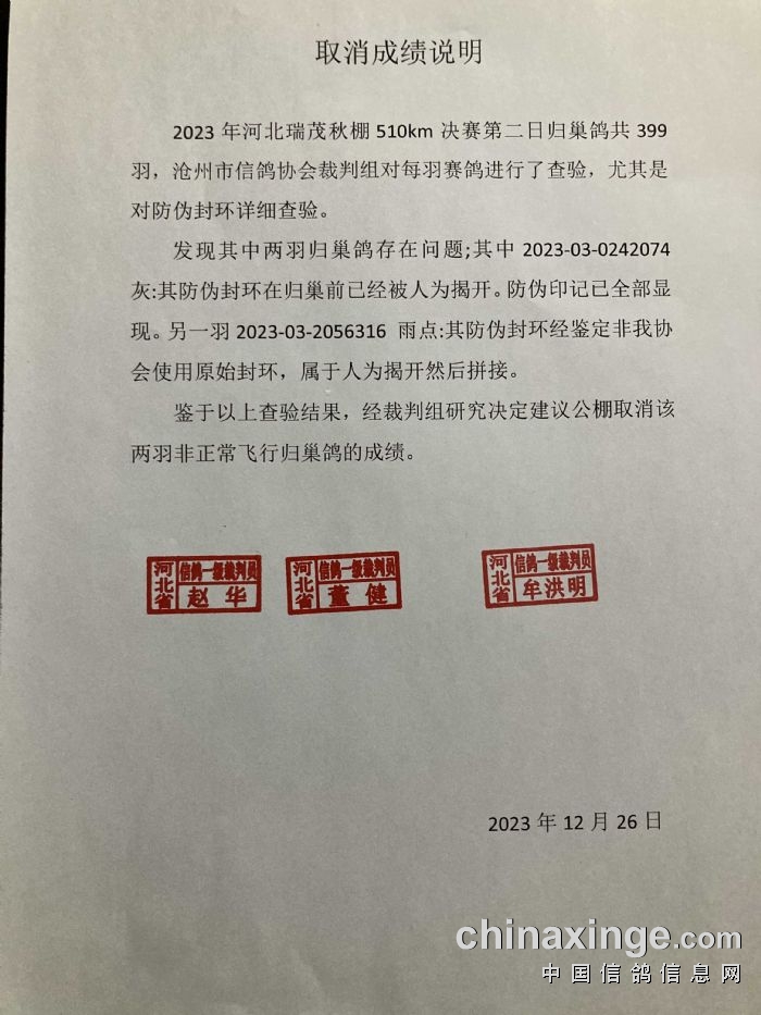 2023年河北瑞茂秋棚510km决赛第二日归巢鸽共399羽,经过沧州市裁判组检验发现两羽参赛鸽存在问题(2023-03-0242074和2023-03-2056316),属于非正常归巢赛鸽,我公棚决定取消两羽赛鸽成绩,以下归巢鸽名次上移。
