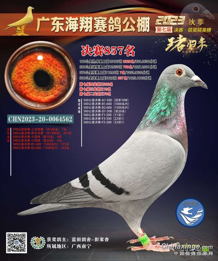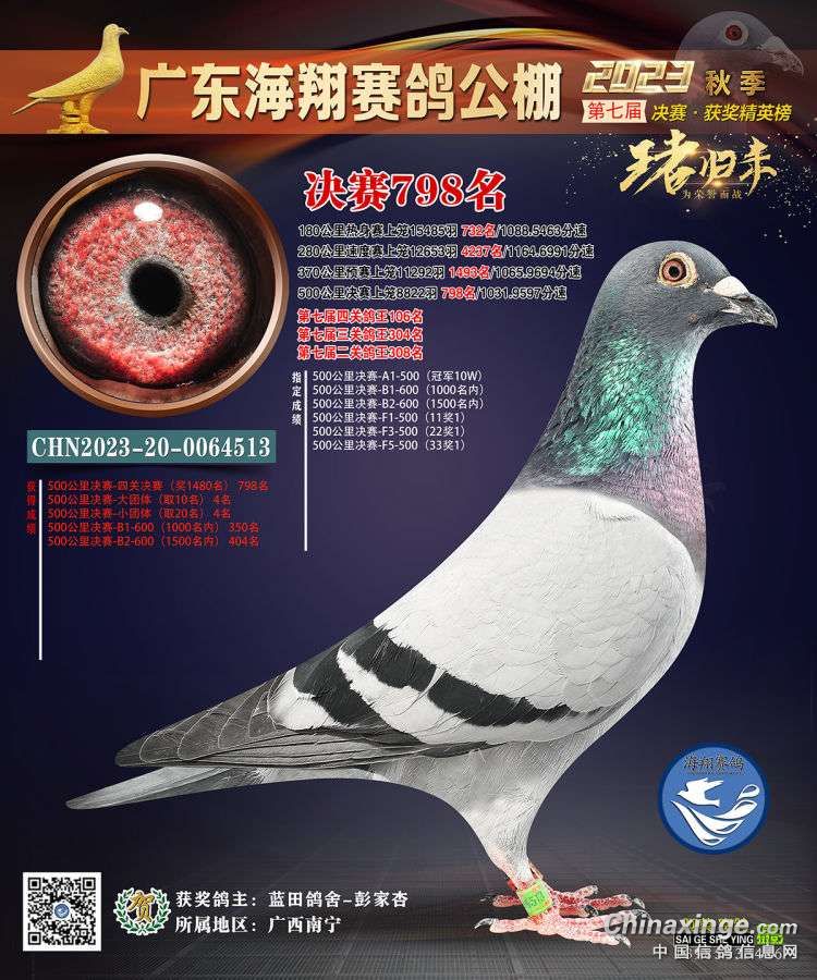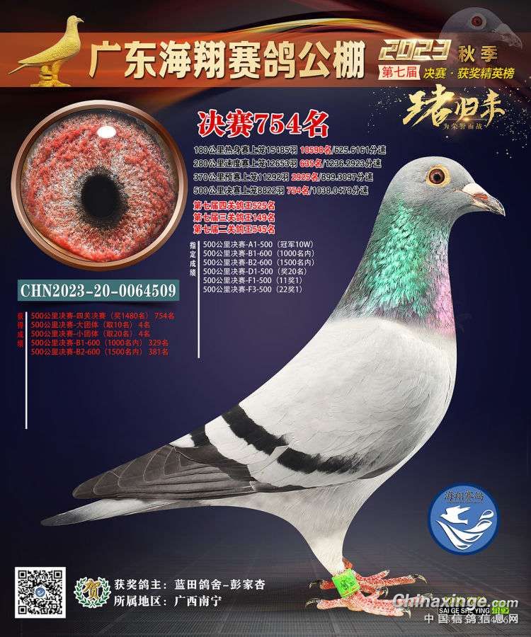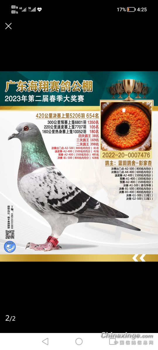 海翔秋季交费10只,决赛上笼5只,回4只,打进3只,获得大团体4名,小团体4名,其中一只预赛7名,前期两个公棚打得没了信心,导致预赛没信心打指定,好在决赛完胜。可惜还是拍卖当天出现小意外,3羽获奖鸽只拍回1羽,漏出2羽主力。