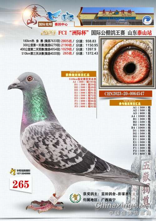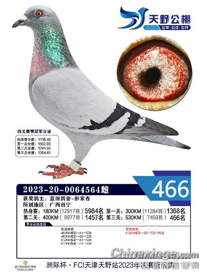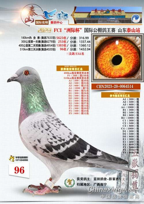 泰山跟天野两个北方棚也是实验性为主,天野缴费6只,决赛入1只,小赢。而泰山由于是东南十一省联赛的公棚,选送的鸽子速度较快,缴费11只,决赛上笼6只,在决赛用海翔的奖金给两只鸽子压通,其他的半通炮,回5只打进4只,通炮两只为第一、第二归巢鸽,实现单场比赛奖金到六位数,广西代表队的总共获取4枚金牌,两只通炮指定鸽分别各占了1枚,本舍共获取2枚金牌。可惜该棚的团体分组未亲自分组,第一指定鸽未编入小团体,错失小团体奖金。