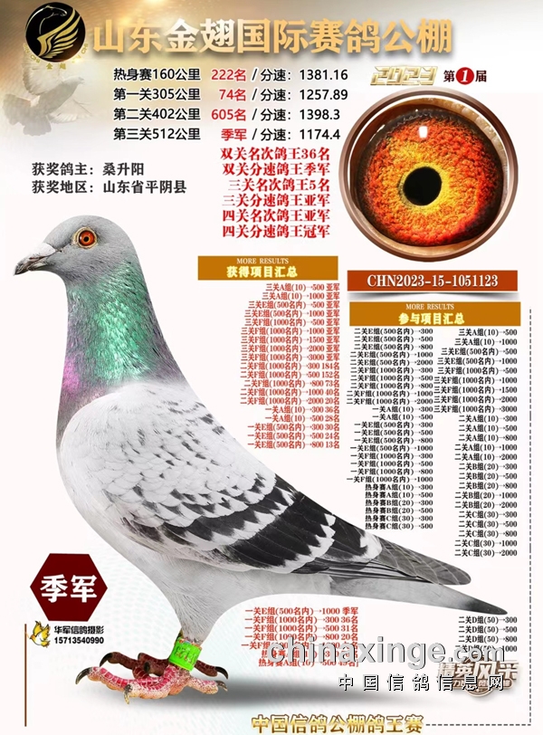 2023年,桑升阳两羽赛鸽出赛山东金翅公棚,一羽浅雨点小雌(1051123)在资格站成功晋级,此后关关表现出色,最终夺得决赛季军、四关鸽王名次亚军、分速冠军,在拍卖大会上拍出全场最高价,被金翅老板孙成科收藏,可见此鸽之非同一般。