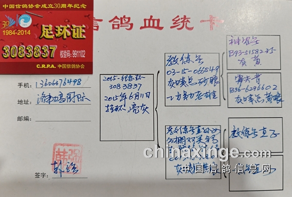说起金翅的季军的血统,桑老师毫不隐瞒。他说金翅鸽王冠军的父亲来自济南韩强鸽舍,血统就是韩强大名鼎鼎的“教练号”回血,戴的是中国信鸽协会成立30年的纪念环,金翅季军就是教练号纪念环的祖孙回血鸽。