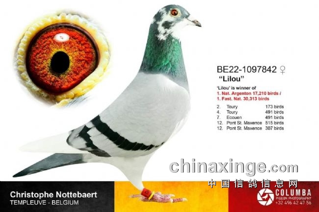 “丽露”(Lilou),赛鸽足环号BE22-1097842,一羽新钻石战将,2023年亚精顿I全国赛一岁鸽组17210羽冠军;30125羽参赛鸽最高分速总冠军!“丽露”为克里斯托夫·诺特巴特带来了3年内第2项全国赛冠军,同时也为他的5项亚军成绩再添光彩。有多少鸽友能说他们在13年内入账7项全国赛前2名呢?恐怕没有多少。