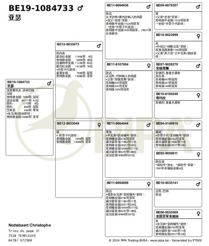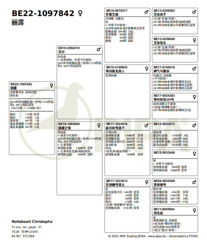 母亲BE19-1084699,出自查特鲁全国13086羽亚军BE17-1033818X波治全国大区1483羽亚军BE17-1033813。