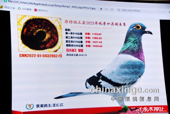 2023年秋,河北省廊坊地区北三县,三河市、香河县、大厂回族自治县联合举办了一场四关鸽王赛,赛程空距510公里到570公里,每周比赛一次,当日归巢有效。