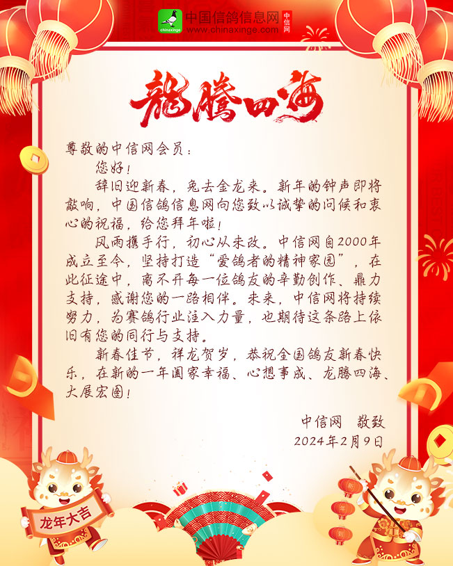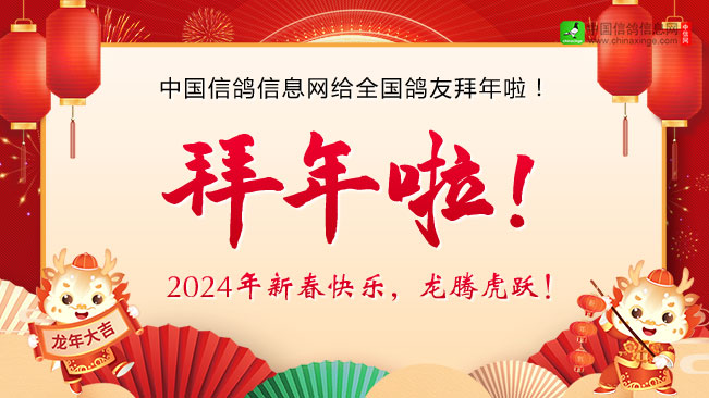 辞旧迎新春,兔去金龙来,新年来临,中国信鸽信息网给您拜年啦!恭祝全国鸽友新春快乐,在新的一年里阖家幸福、心想事成、龙腾四海、大展宏图!