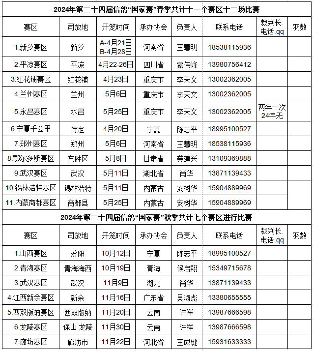 赛事分为春、秋两个赛季,近20场比赛,其中春季11个赛区,12场比赛,鸽友们关注的四川平凉大赛、新乡国家赛、郑州国家赛以及武汉国家赛在列,于四、五月燃起战火。此外,今年宁夏千公里联赛首次归入国家赛日程,预计4月20日放飞,司放地待定。