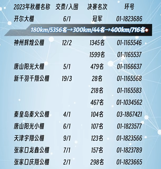 3、唐山阳光大棚:交费5羽,入围一羽,斩获479名。