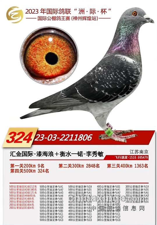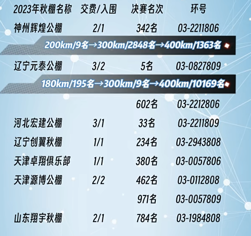 1、神州辉煌公棚:交费两羽,入围一羽,获得342名。这羽获奖鸽环号03-2211806,在200公里斩获9名,300公里、400名分别获得2848名、1363名。