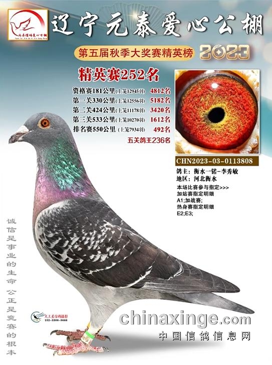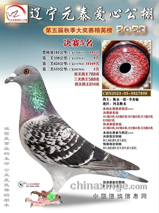 2、辽宁元泰公棚:交费3羽,入围两羽,分别获得5名、602名。加站赛入赏1羽,斩获252名。斩获决赛5名的这羽赛鸽,足环号03-0827809,前两关战绩同样不错,180公里飞出195名,300公里斩获9名。